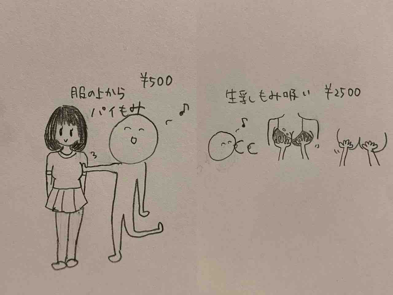 ・生乳揉み&吸い¥2500 の2種類がπオプションではありますが、上記のイラストだと下着の上からモミモミは、生肌に触れて下着も谷間も触ることができる状態なので《生乳揉み&吸い》になります⭐️